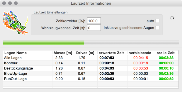 Das Bild (rechts) zeigt eine Laufzeit-Berechnung mitten in der Ausgabe: Die Lage "Kontur" wird aktuell bearbeitet, in Rot wird die Restzeit der auszugebenden Lagen angezeigt, Grün wird die tatsächliche Ausgabezeit (bis zum aktuellen Stand bzw. der letzten vollständigen Ausgabe) angezeigt.